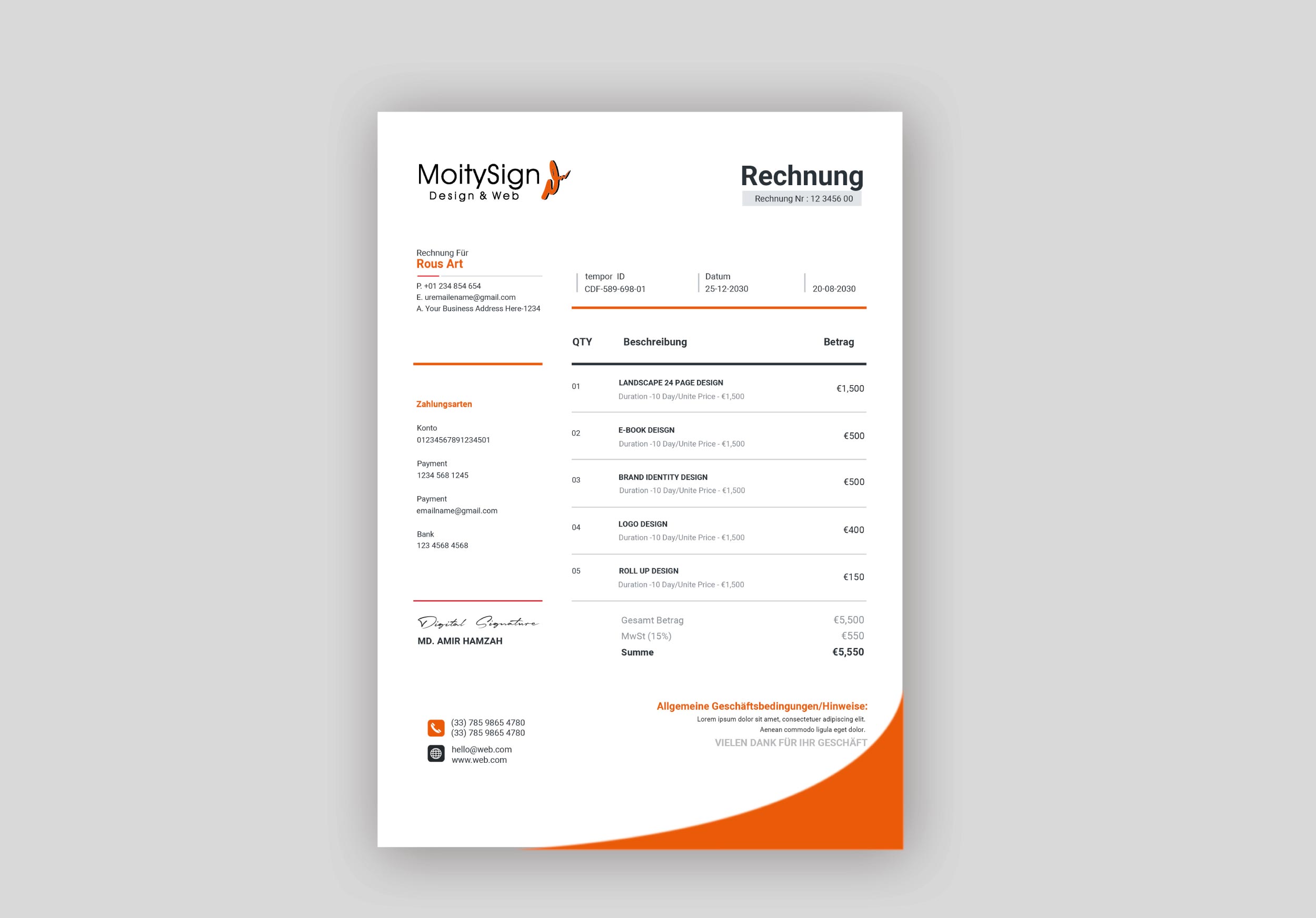 Eine Handelsrechnung mit Firmenlogo, Firmenbriefkopf, Kontaktinformationen, Zahlungsinformationen, Adresse und Kundenkontaktinformationen.